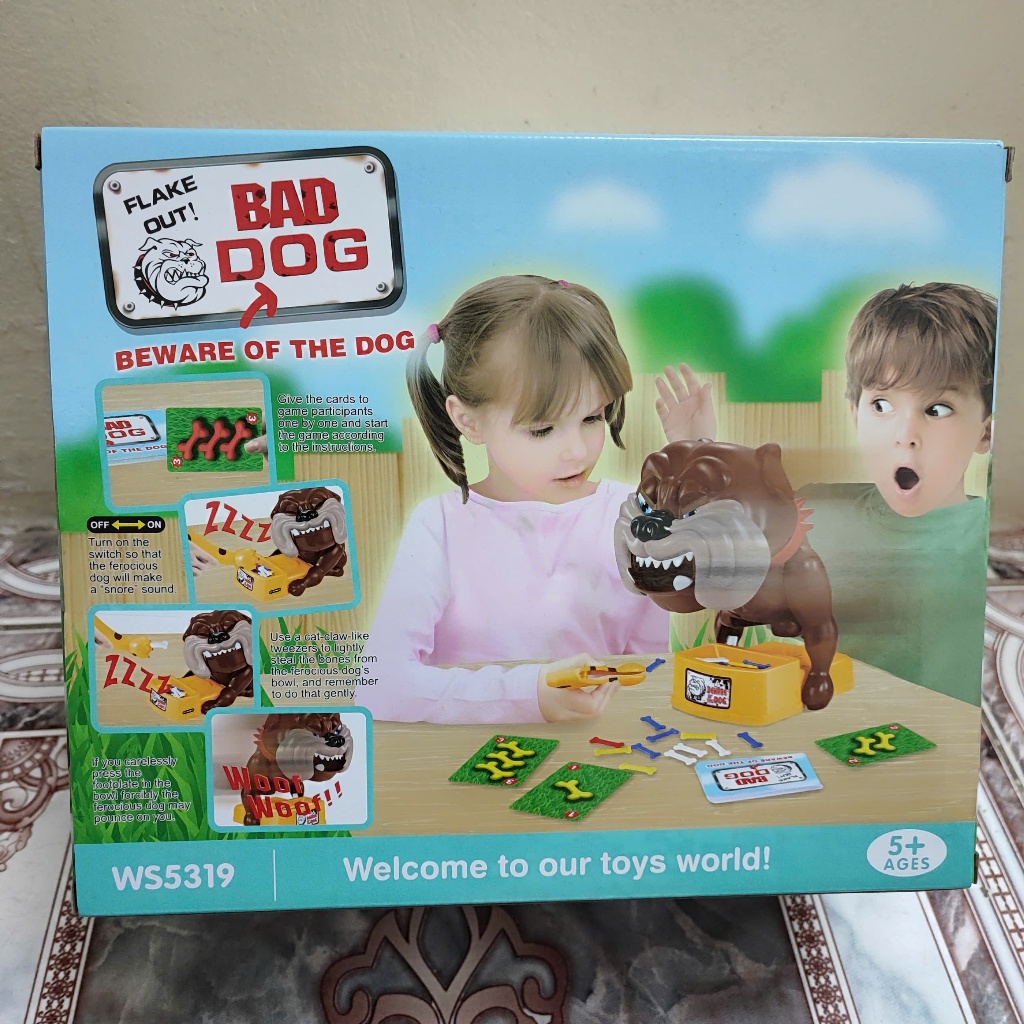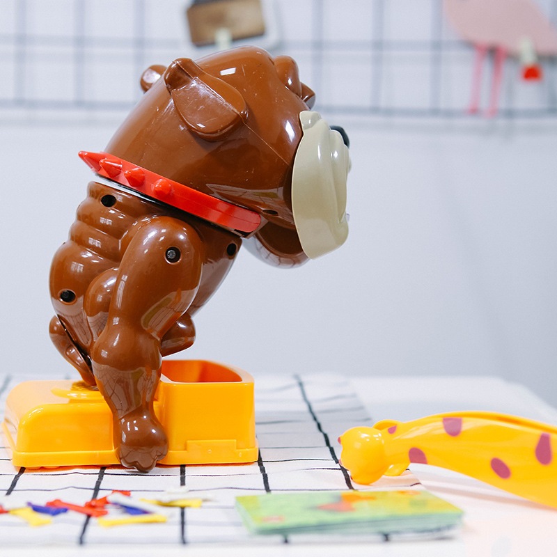– Đồ chơi gồm: 1 con Bulldog, xương với 4 màu xanh trắng vàng và đỏ, 1 bộ thẻ rút xương, 1 khay đựng xương, 1 cái gắp xương.