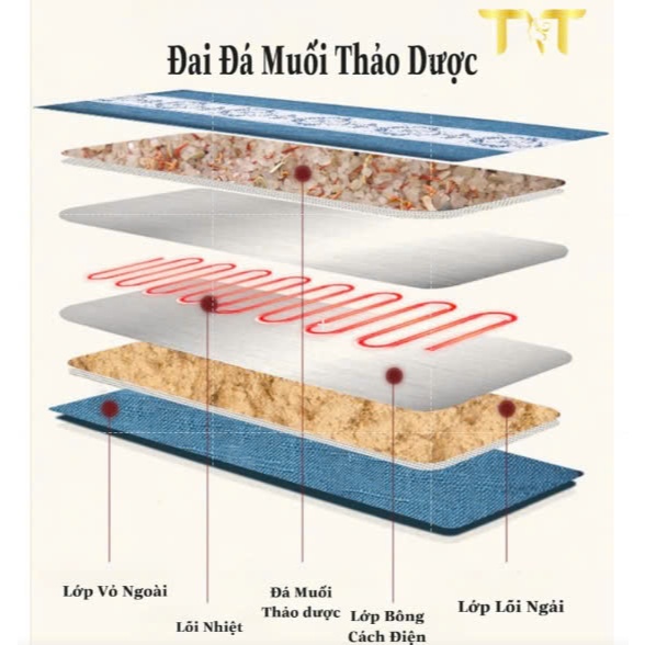 Đai gồm 3 lớp, bên trong là lớp lõi sinh nhiệt và lớp muối thảo dược đã gắn cố định, bao bên ngoài là lớp vải mềm chắc chắn.